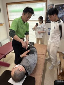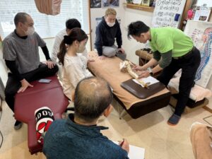 座学の後は、いよいよ技術の伝承です。今回は特に重要度の高い**「骨盤」と「頸椎」**のアジャストメントに時間を割きました。
